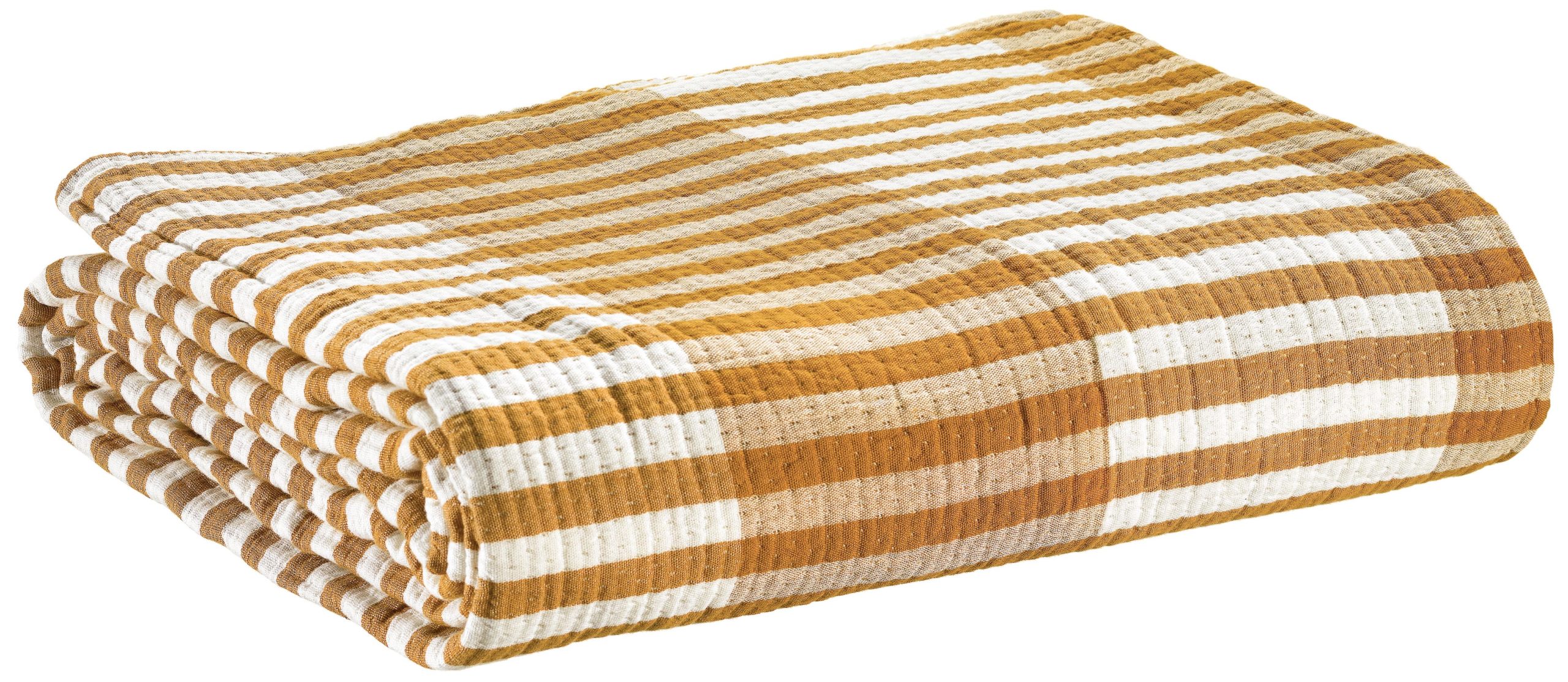 Le jeté de lit Calista Safran est fabriqué en jacquard 100% coton, une matière naturelle reconnue pour sa douceur, sa respirabilité et sa résistance. Le tissage jacquard crée un motif rayé en relief, offrant une belle tenue au tissu et une finition haut de gamme.