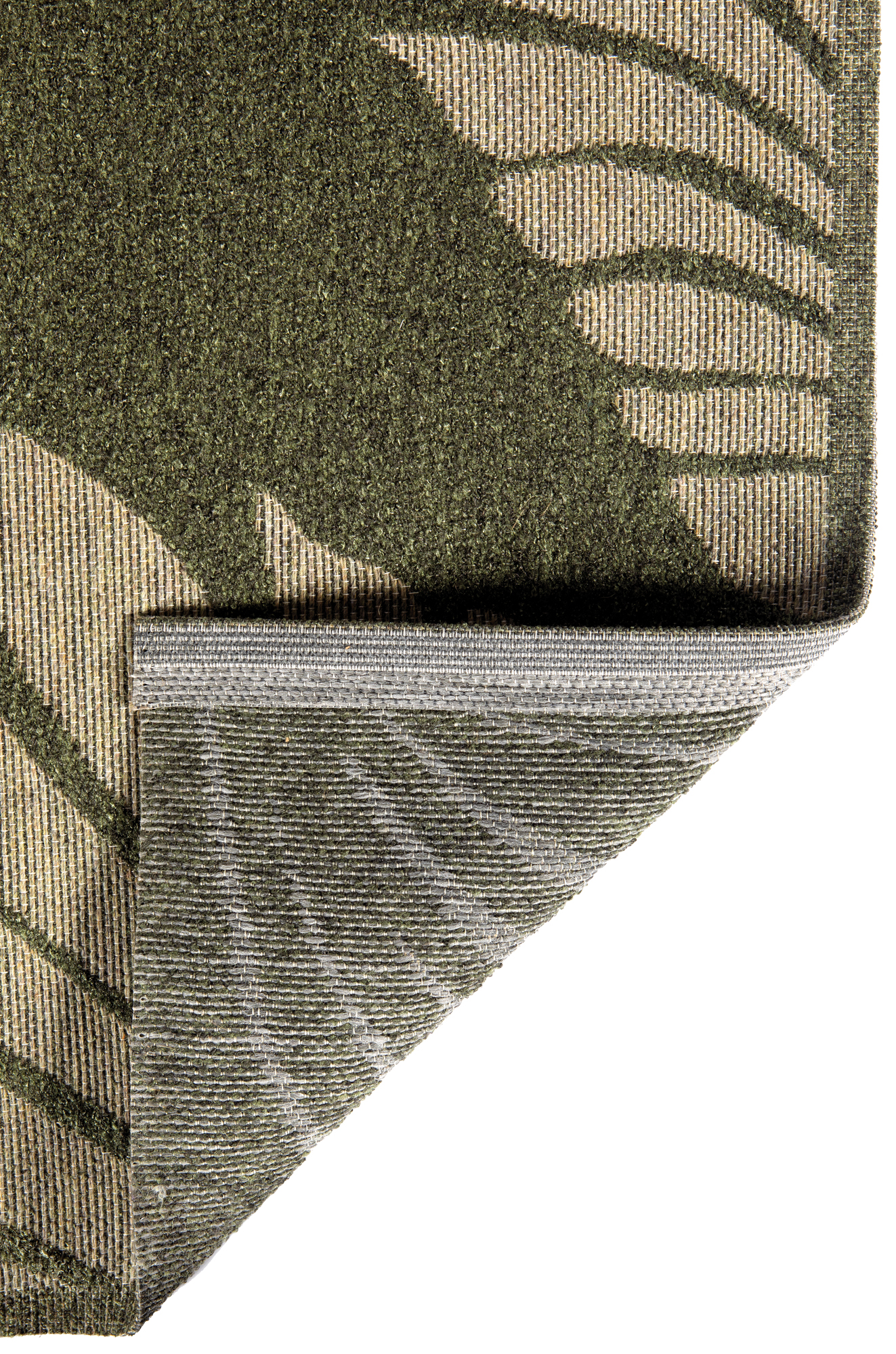 Structurez votre terrasse ou balcon avec le tapis Nilos outdoor eucalyptus 200 x 290, un grand tapis d’extérieur Vivaraise en 100% polyester recyclé, résistant au soleil et à la pluie, au motif feuille graphique qui sublime votre espace outdoor.